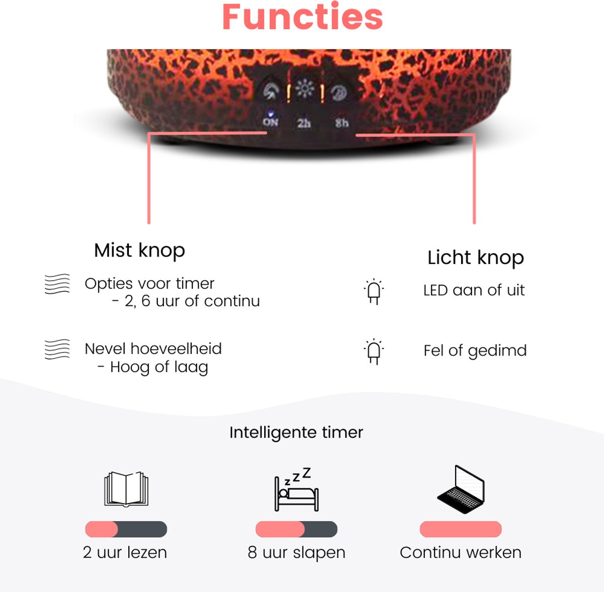 - Tijdinstelling 2H / 8H – Kies eenvoudig hoe lang je het apparaat wilt laten werken.